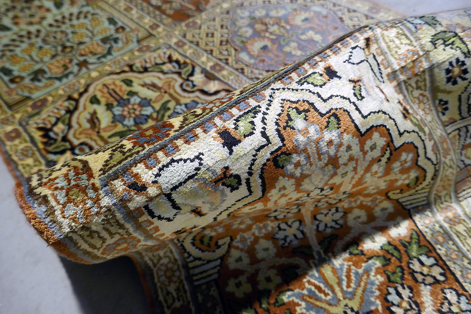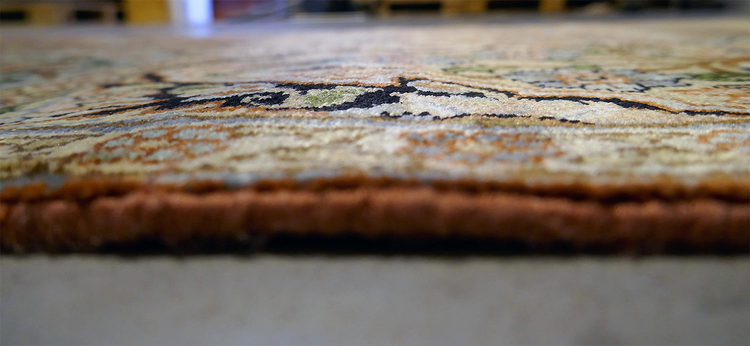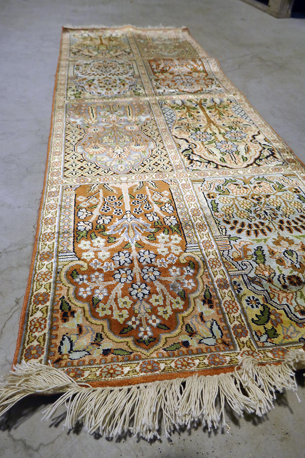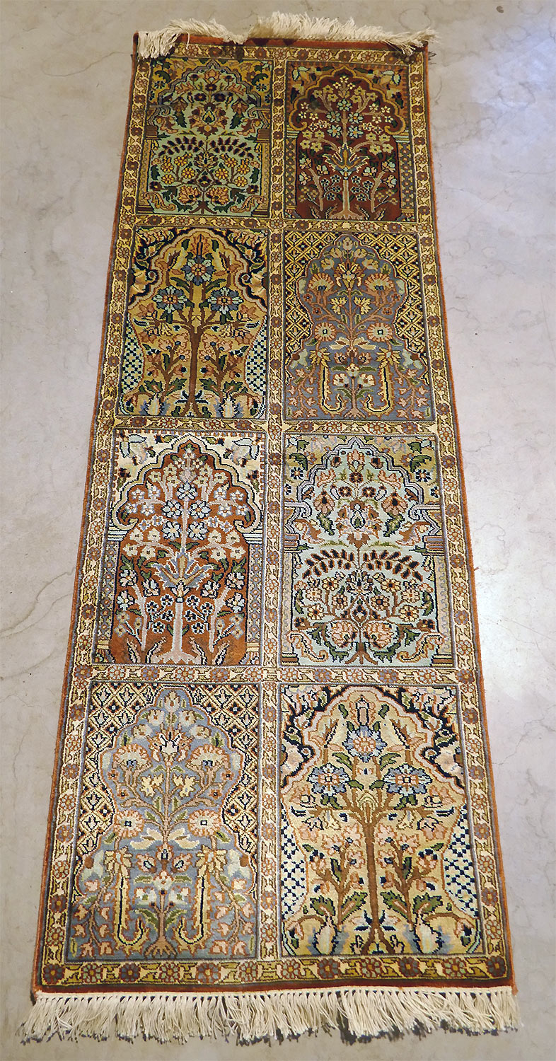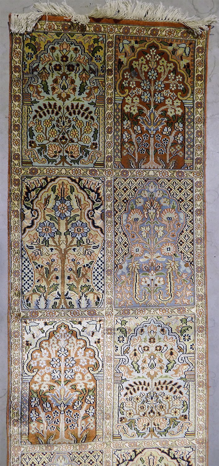 Dimensions : 170 x 65 cm -soie- Pays Inde - Épaisseur : 6 mm - Densité de nouage : 500.000 Nœuds au m² - Surface : 1.11 m² - Poids : 2.21 Kgs - Age : contemporain - Confection : Noué main - Forme : Tapis de couloirs - Type : Tapis Oriental