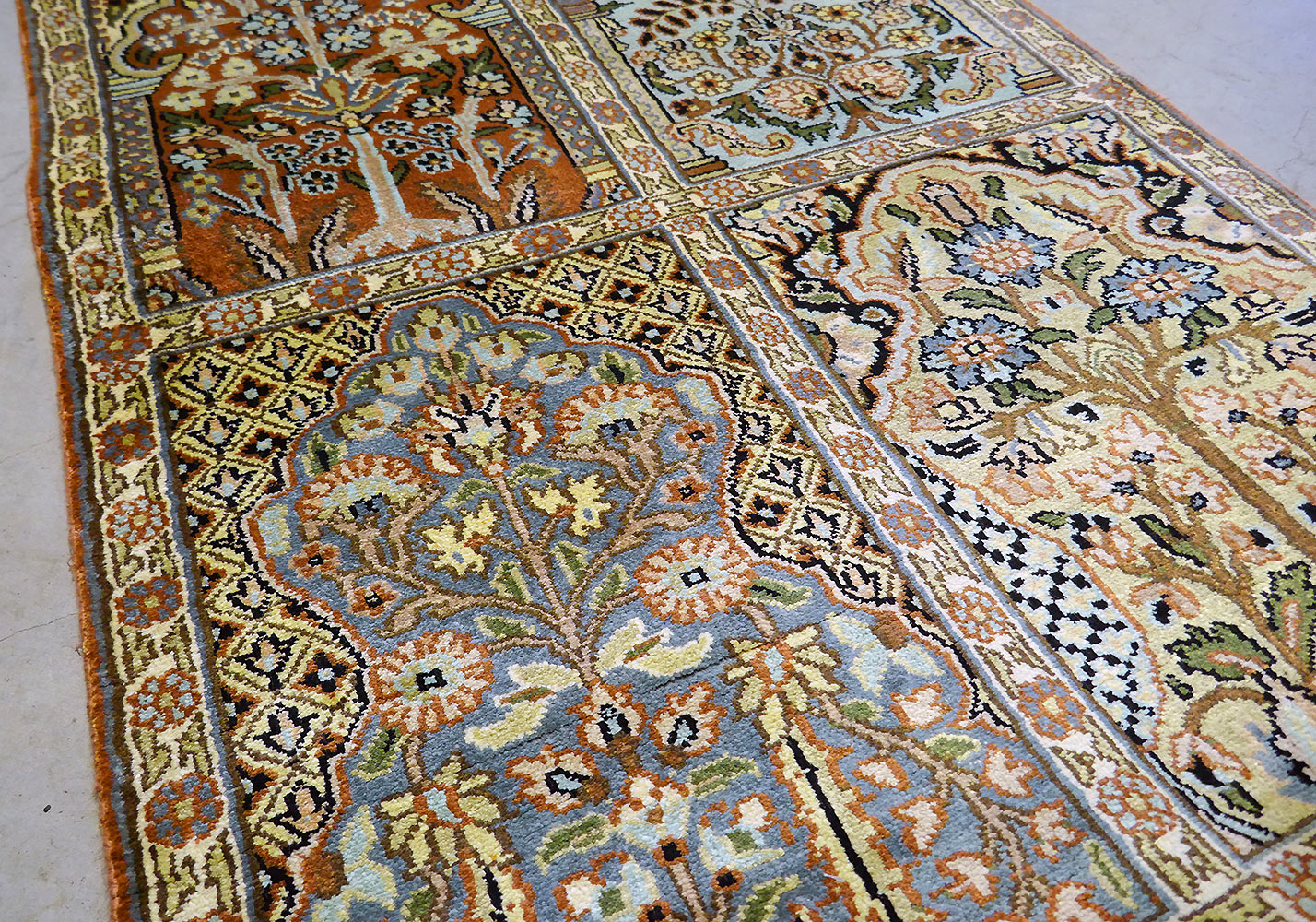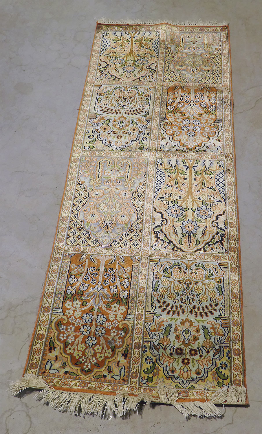 Dimensions : 179 x 64 cm -soie- Pays Inde - Épaisseur : 6 mm - Densité de nouage : 500.000 Nœuds au m² - Surface : 1.15 m² - Poids : 2.29 Kgs - Age : contemporain - Confection : Noué main - Forme : Tapis de couloirs - Type : Tapis Oriental