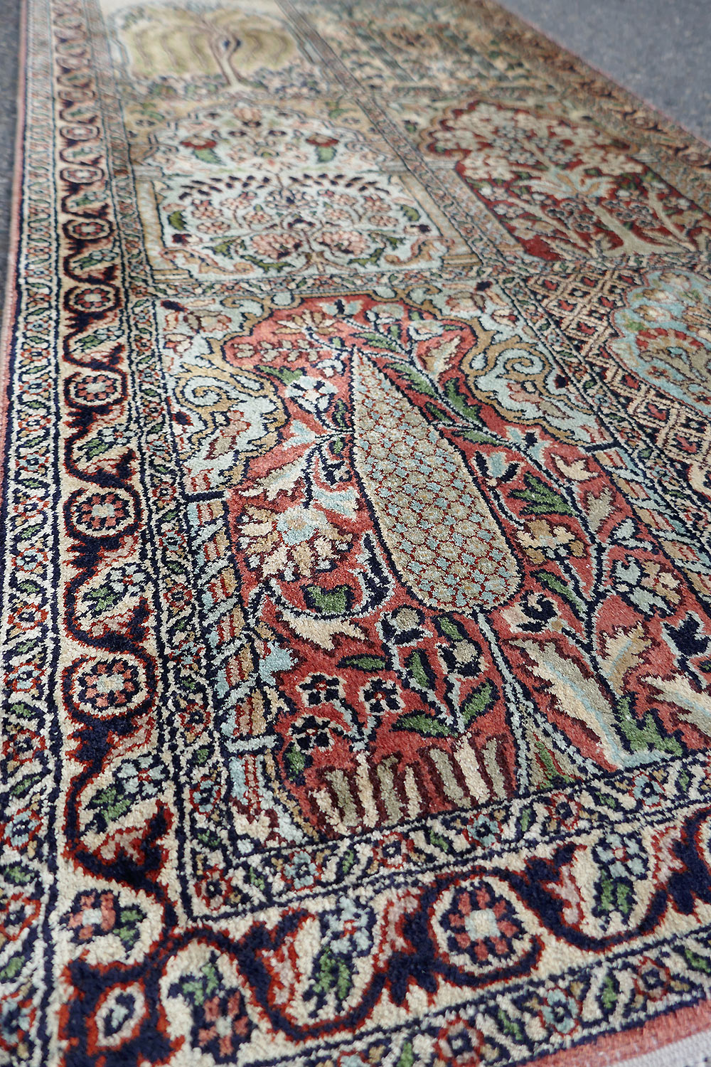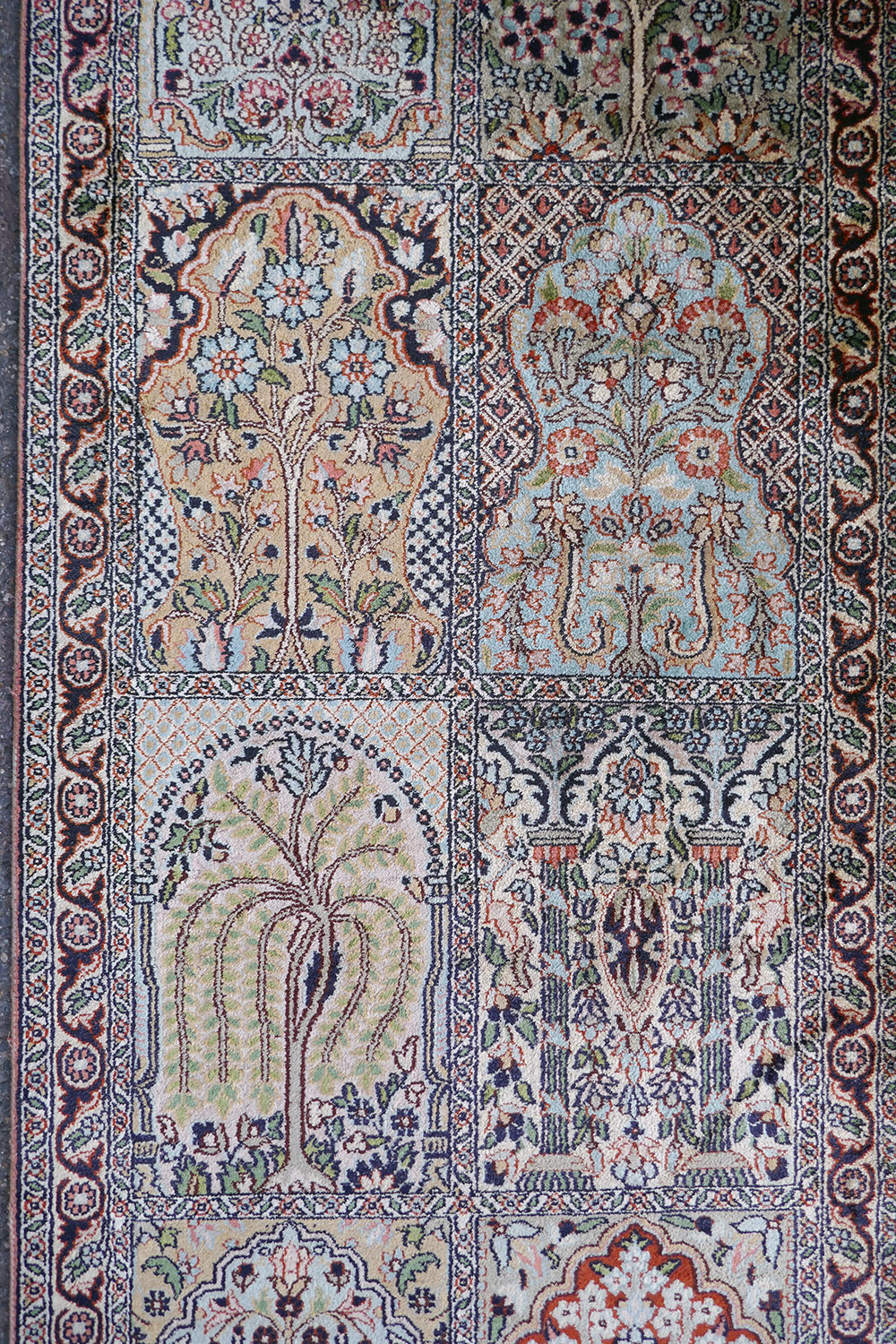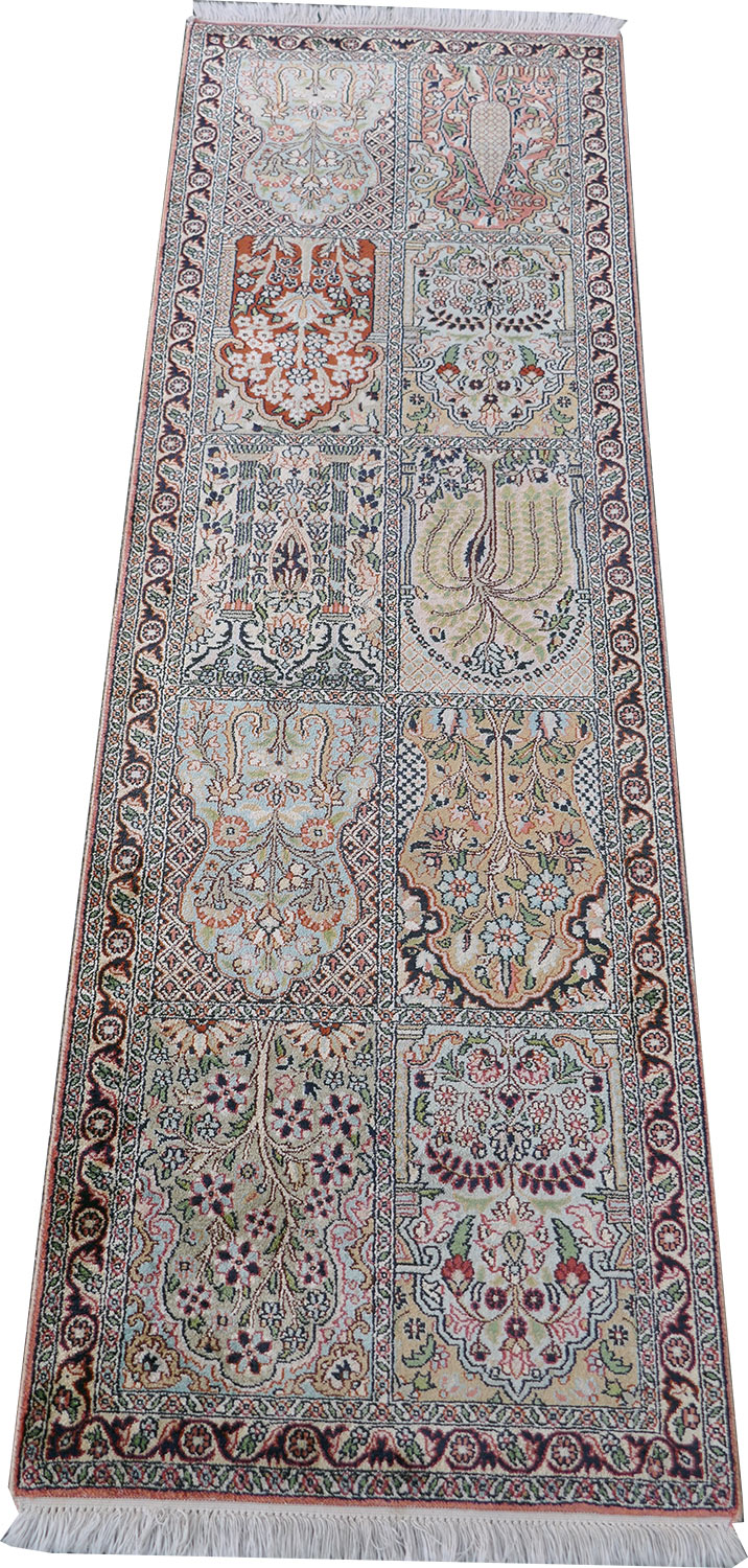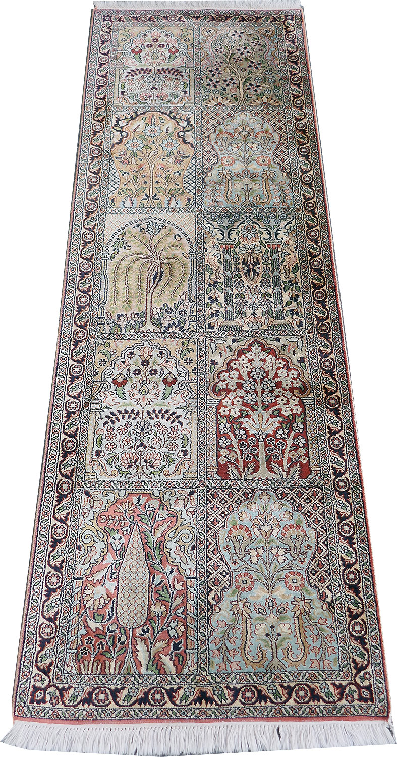 Dimensions : 179 x 64 cm -soie- Pays Inde - Épaisseur : 6 mm - Densité de nouage : 500.000 Nœuds au m² - Surface : 1.15 m² - Poids : 2.29 Kgs - Age : contemporain - Confection : Noué main - Forme : Tapis de couloirs - Type : Tapis Oriental