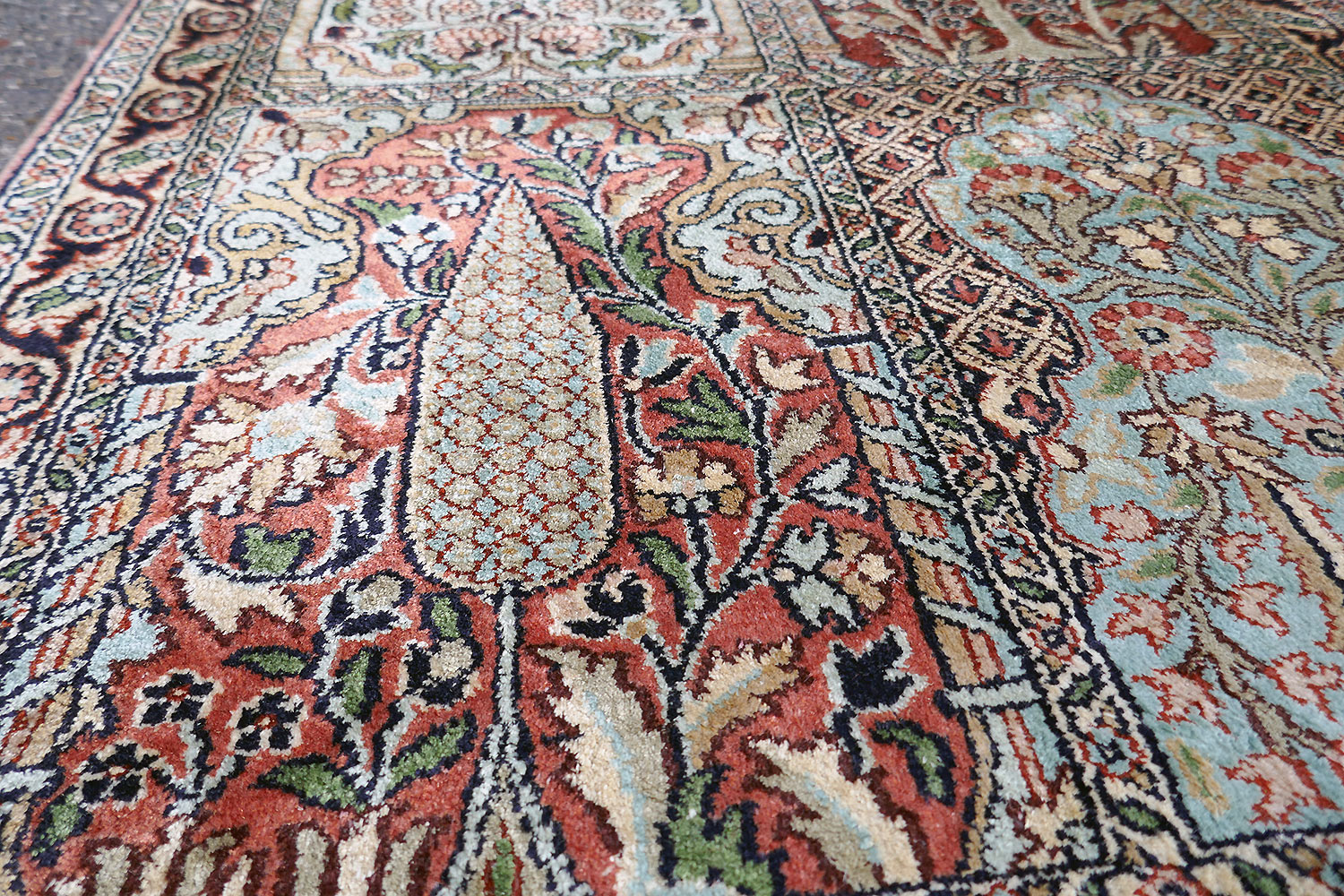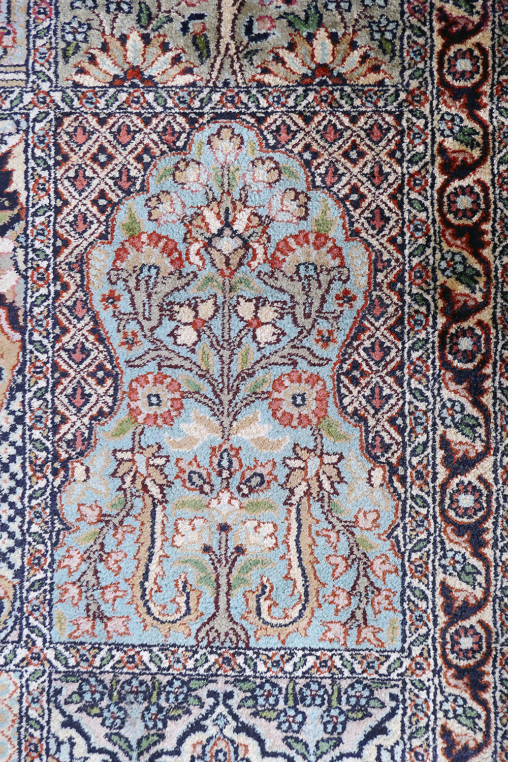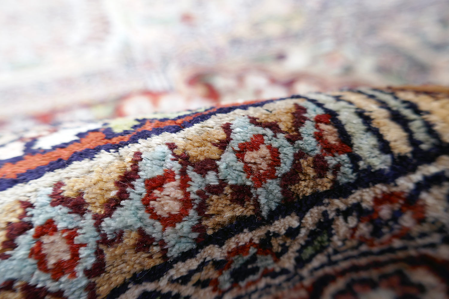 Dimensions : 179 x 64 cm -soie- Pays Inde - Épaisseur : 6 mm - Densité de nouage : 500.000 Nœuds au m² - Surface : 1.15 m² - Poids : 2.29 Kgs - Age : contemporain - Confection : Noué main - Forme : Tapis de couloirs - Type : Tapis Oriental