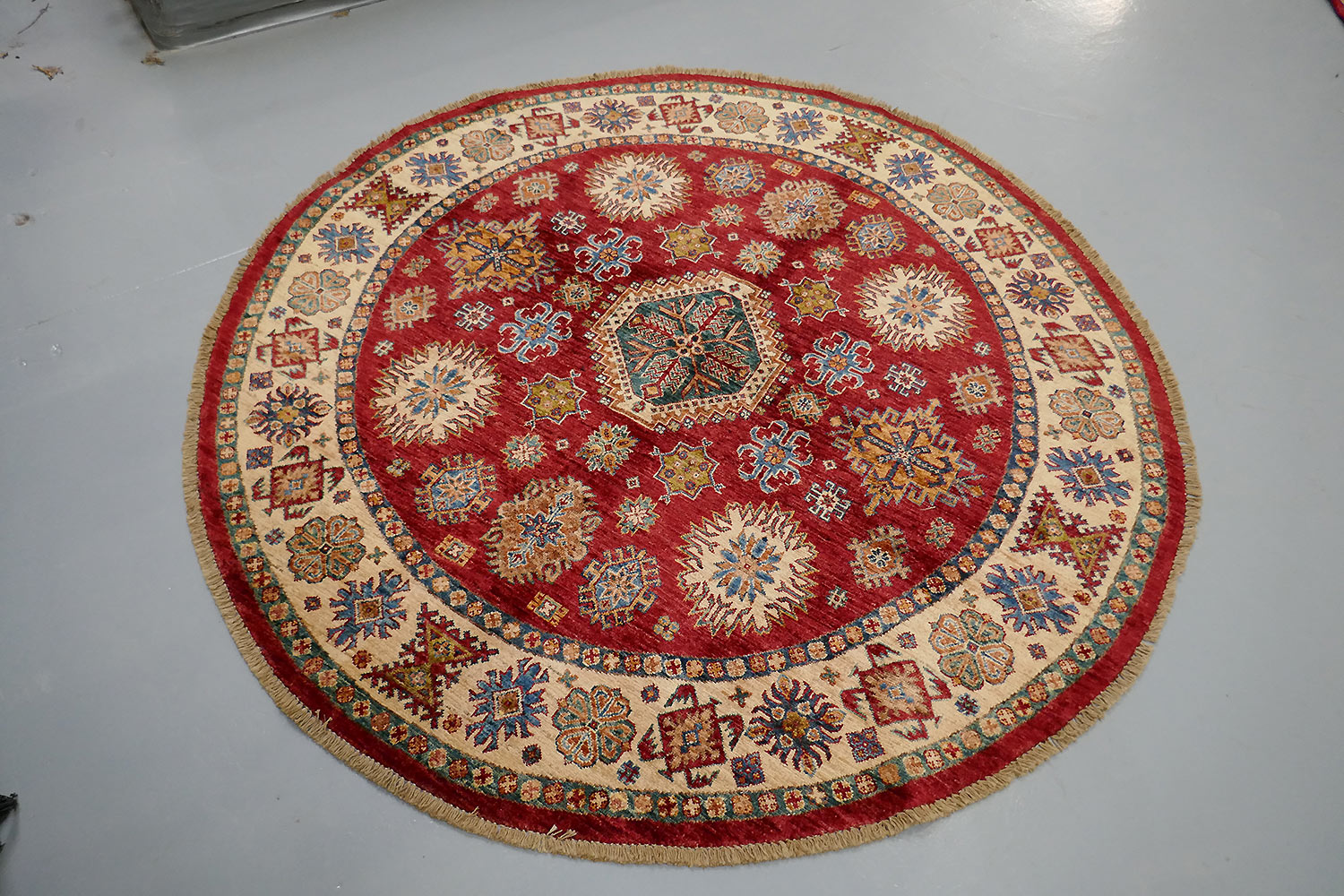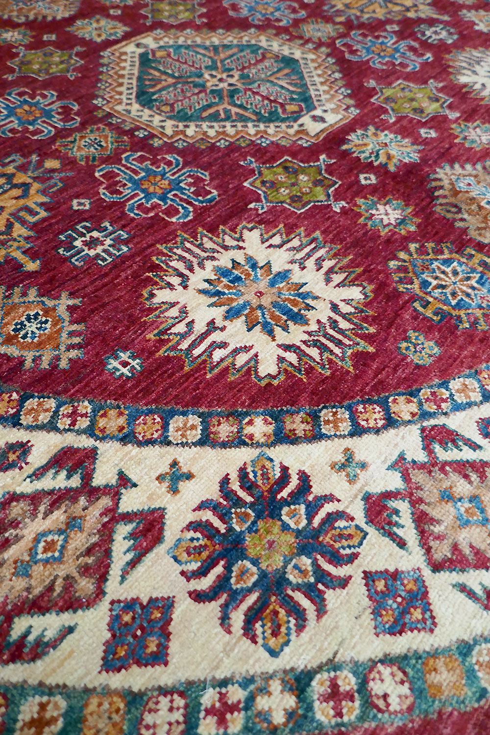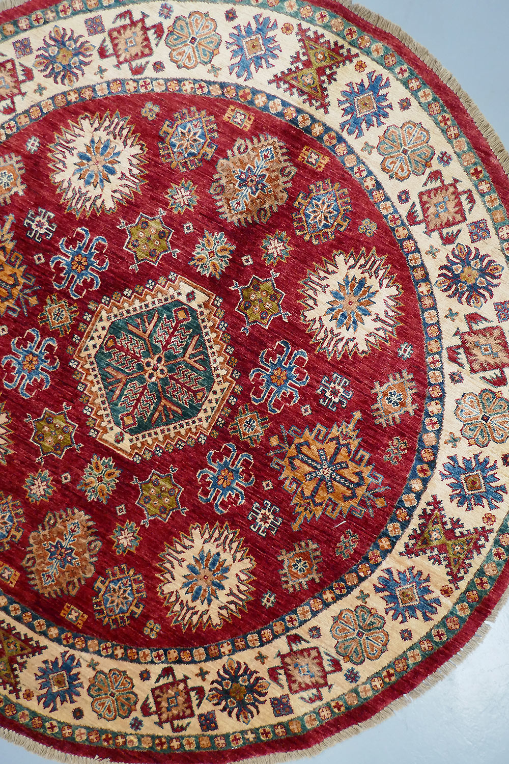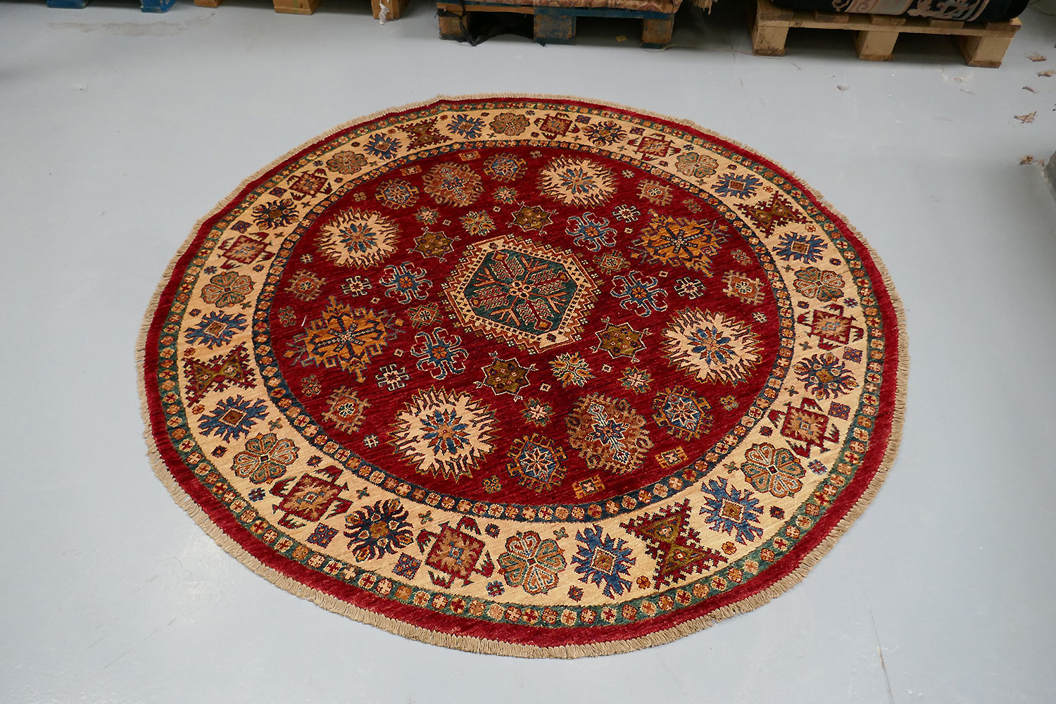 Dimensions : 185 x 185 cm -laine- Pays Afghanistan - Épaisseur : 8 mm - Densité de nouage : 300.000 Nœuds au m² - Surface : 3.42 m² - Poids : 10.27 Kgs - Age : contemporain - Confection : Noué main - Forme : Tapis rond - Type : Tapis Oriental