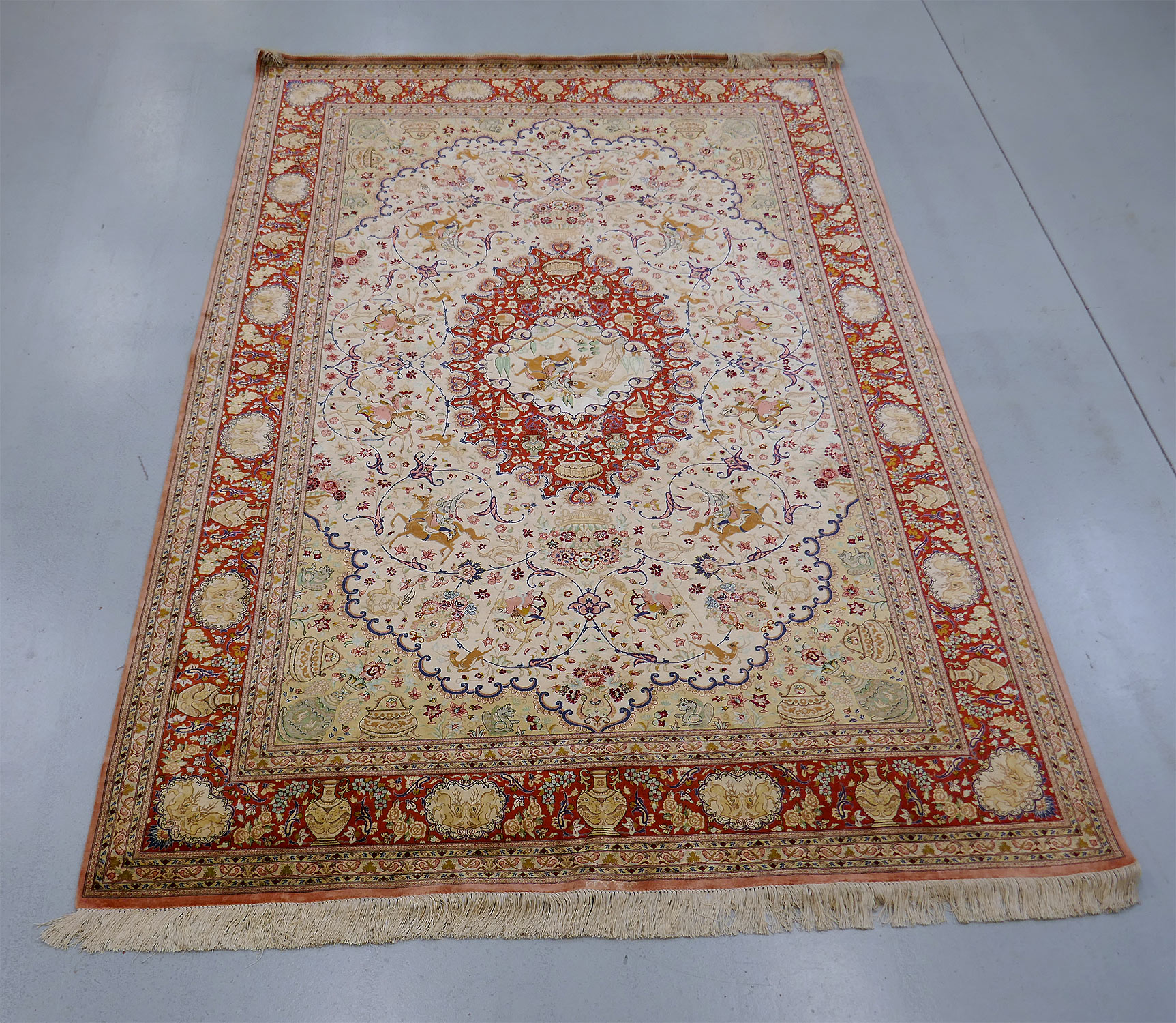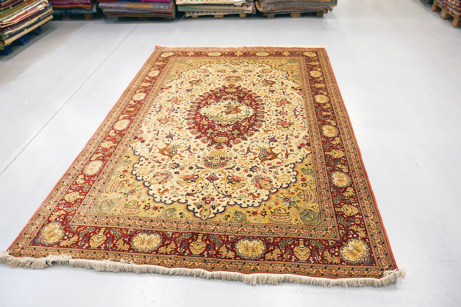 Dimensions : 293 x 198 cm -soie- Pays Iran - Épaisseur : 3 mm - Densité de nouage : 1.000.000 Nœuds au m² - Surface : 5.8 m² - Poids : 11.6 Kgs - Age : contemporain - Confection : Noué main - Forme : Tapis de salon - Type : Tapis persan