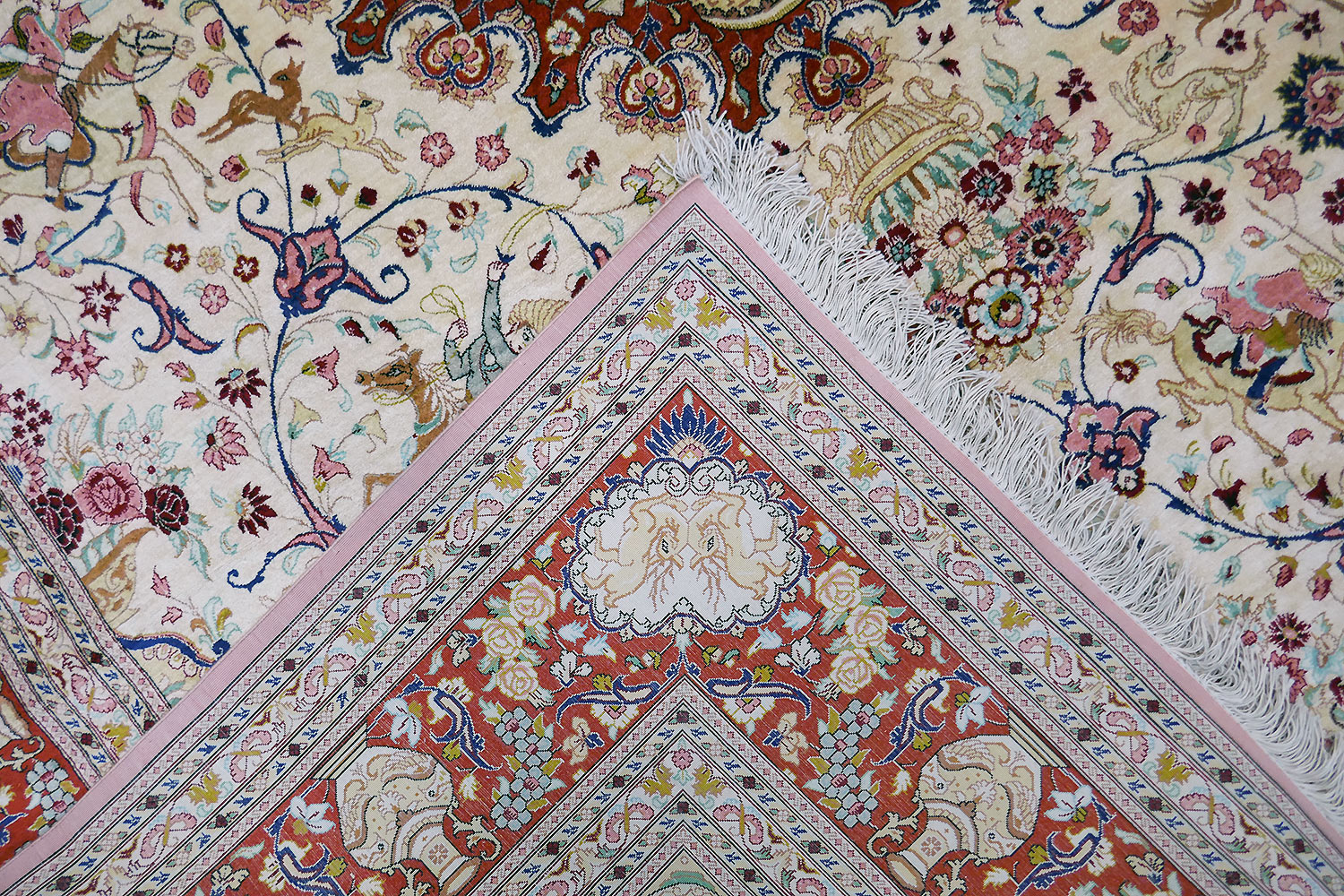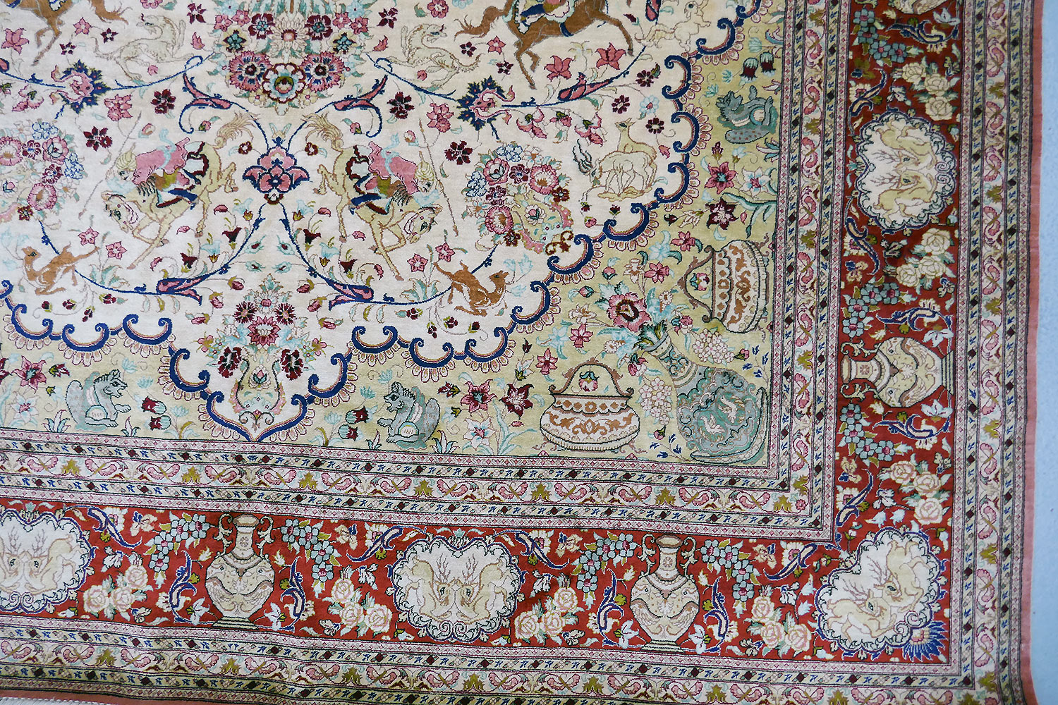 Dimensions : 293 x 194 cm -soie- Pays Iran - Épaisseur : 3 mm - Densité de nouage : 1.000.000 Nœuds au m² - Surface : 5.68 m² - Poids : 11.37 Kgs - Age : contemporain - Confection : Noué main - Forme : Tapis de salon - Type : Tapis persan