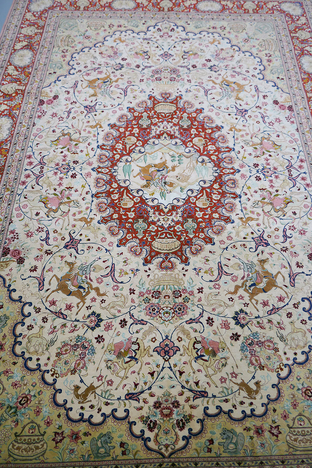 Dimensions : 300 x 200 cm -soie- Pays Iran - Épaisseur : 3 mm - Densité de nouage : 1.000.000 Nœuds au m² - Surface : 6 m² - Poids : 12 Kgs - Age : contemporain - Confection : Noué main - Forme : Tapis de salon - Type : Tapis persan