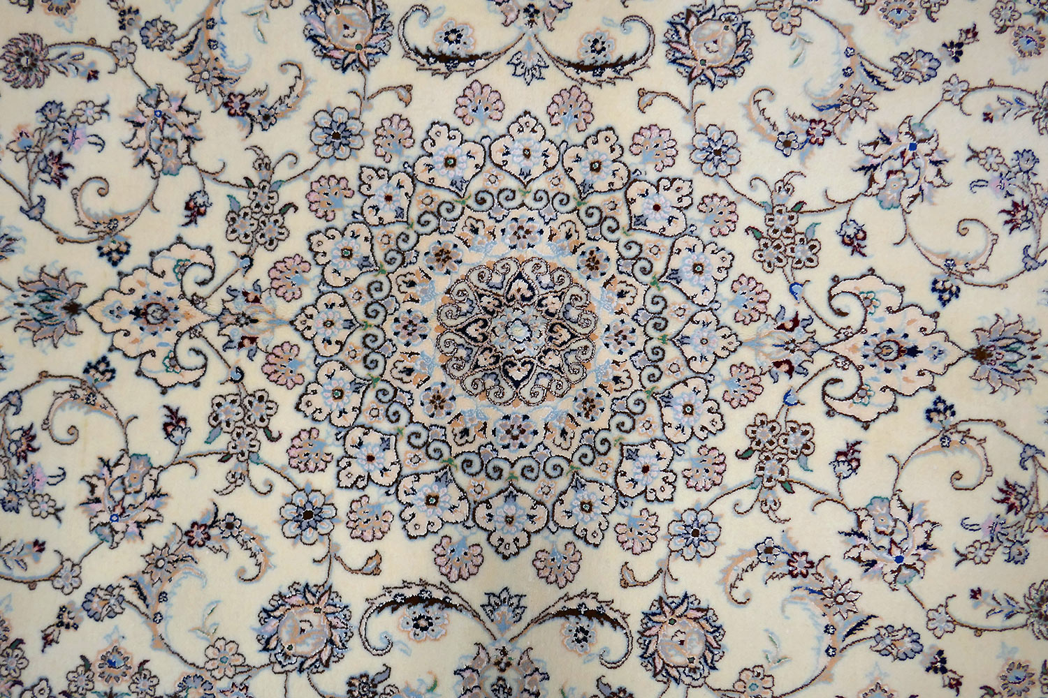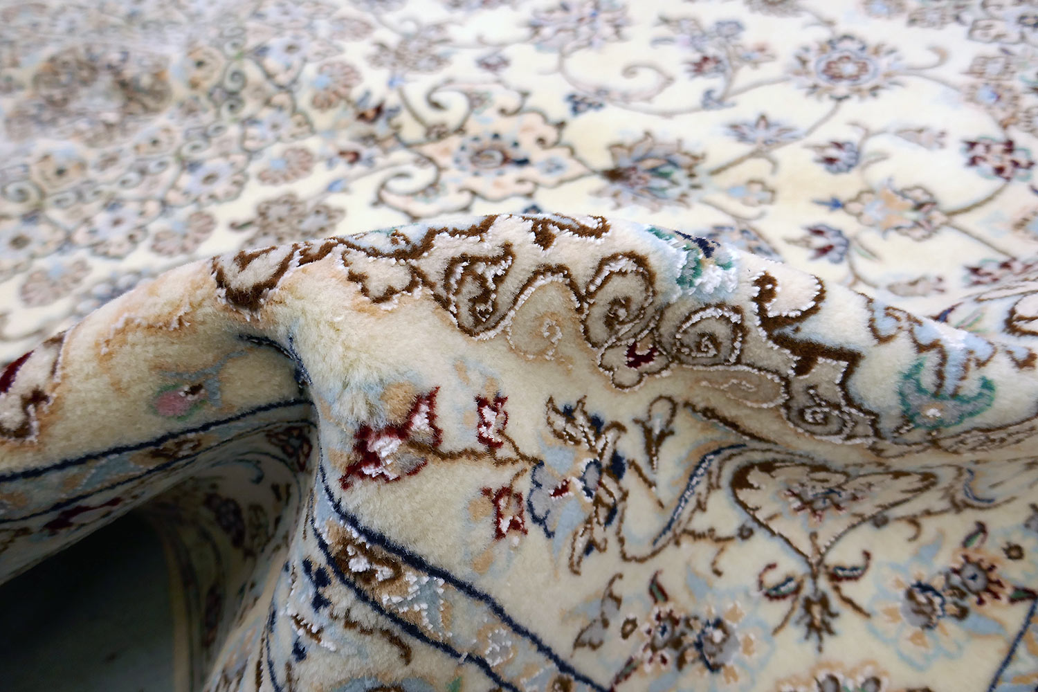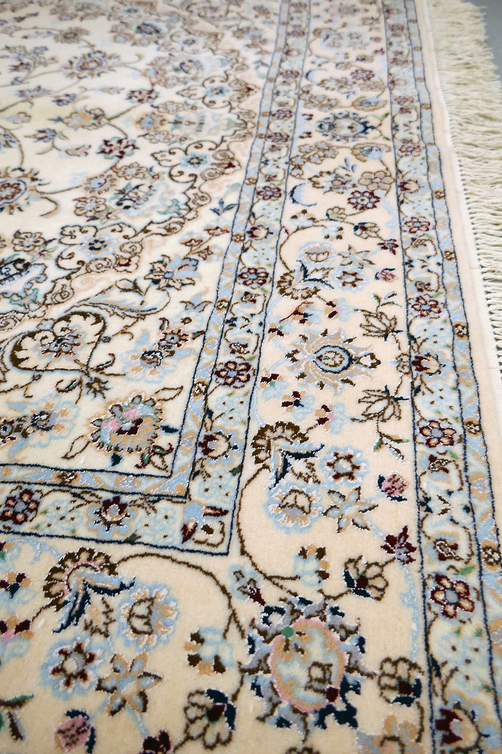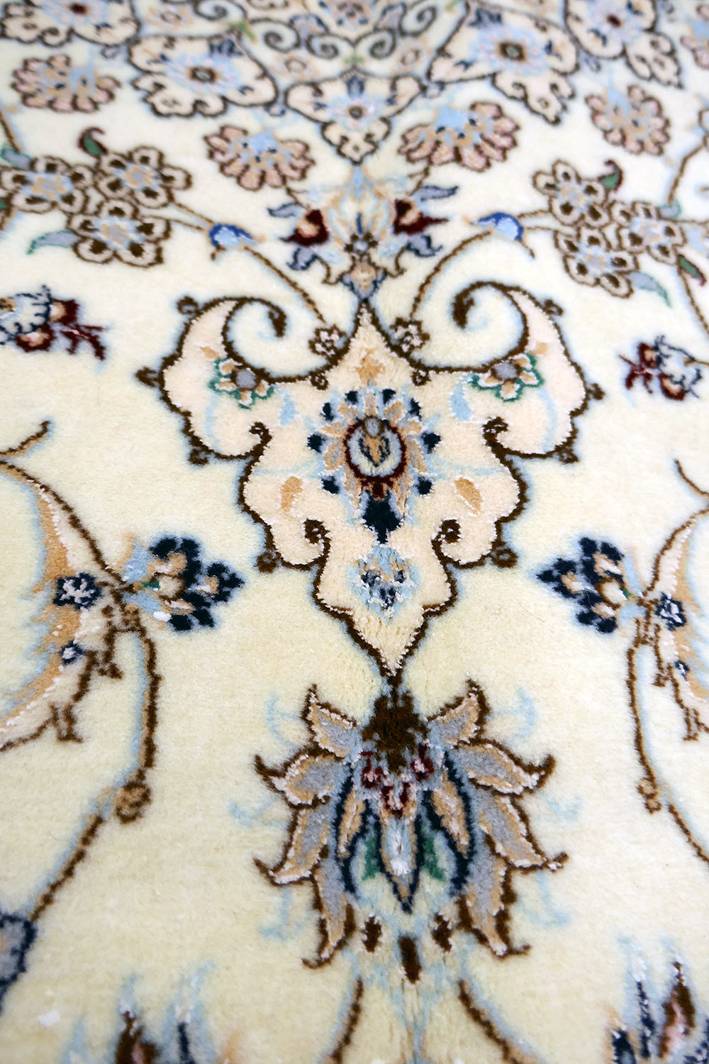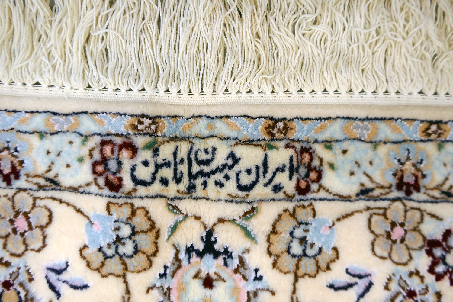 Dimensions : 245 x 164 cm -laine et soie- Pays Iran - Épaisseur : 8 mm - Densité de nouage : 800.000 Nœuds au m² - Surface : 4.02 m² - Poids : 10.05 Kgs - Age : contemporain - Confection : Noué main - Forme : Tapis de chambre - Type : Tapis persan