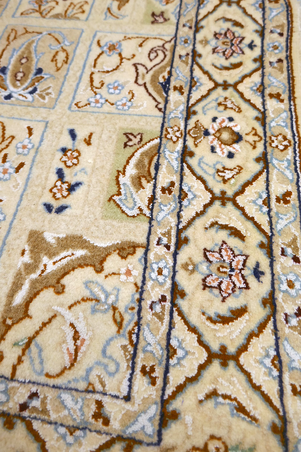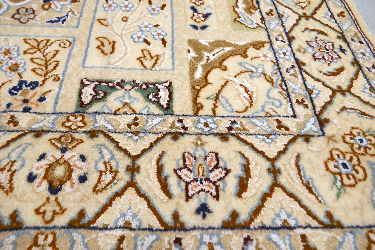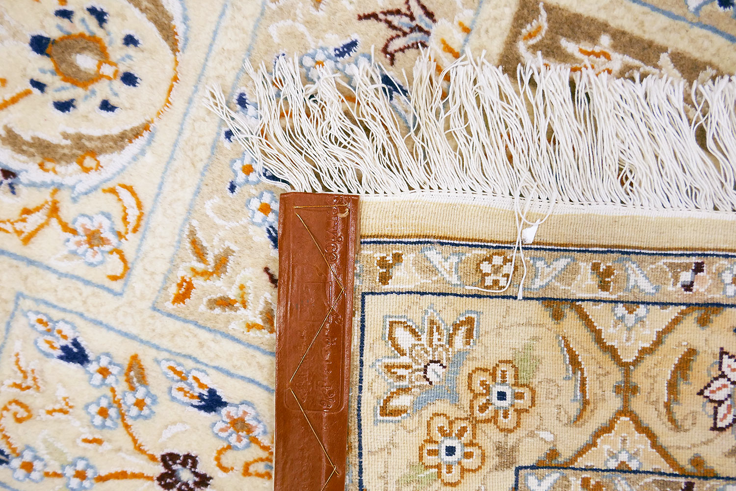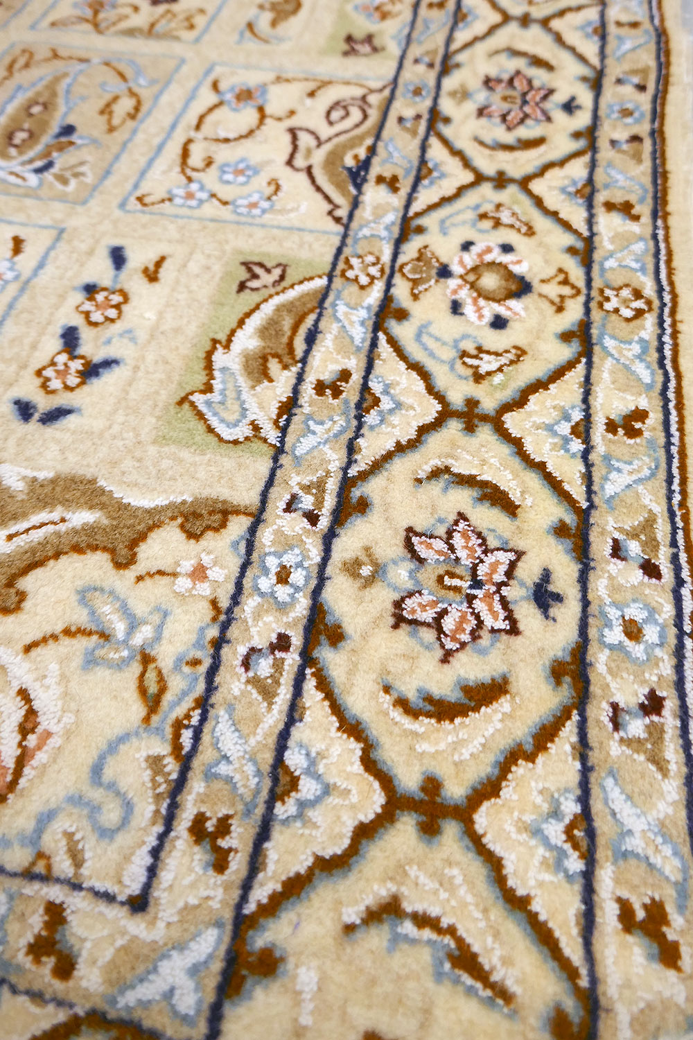 Dimensions : 210 x 130 cm -laine et soie- Pays Iran - Épaisseur : 9 mm - Densité de nouage : 360.000 Nœuds au m² - Surface : 2.73 m² - Poids : 6.83 Kgs - Age : contemporain - Confection : Noué main - Forme : Tapis de chambre - Type : Tapis persan