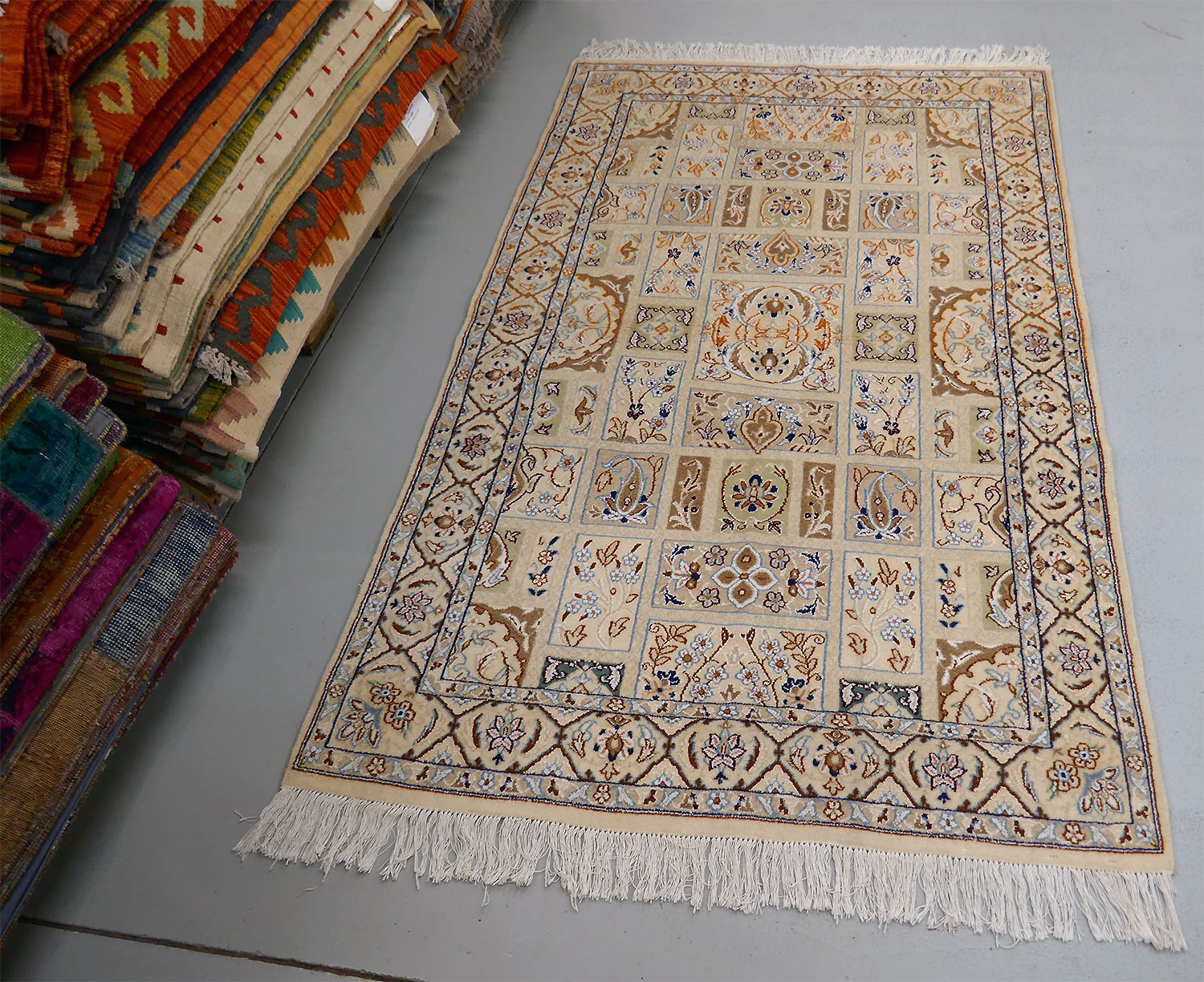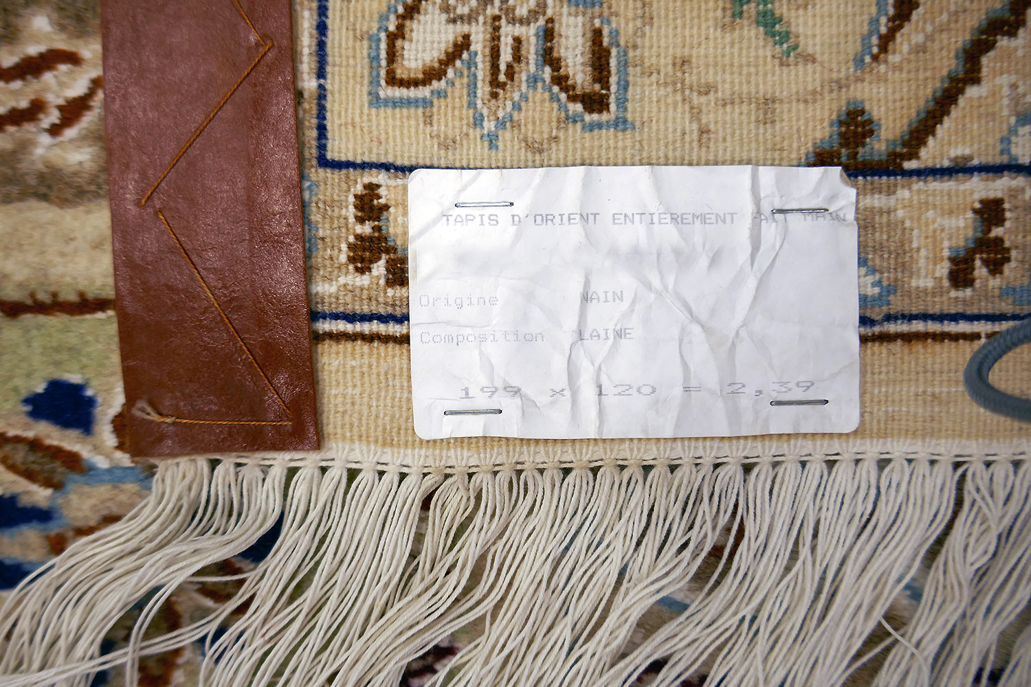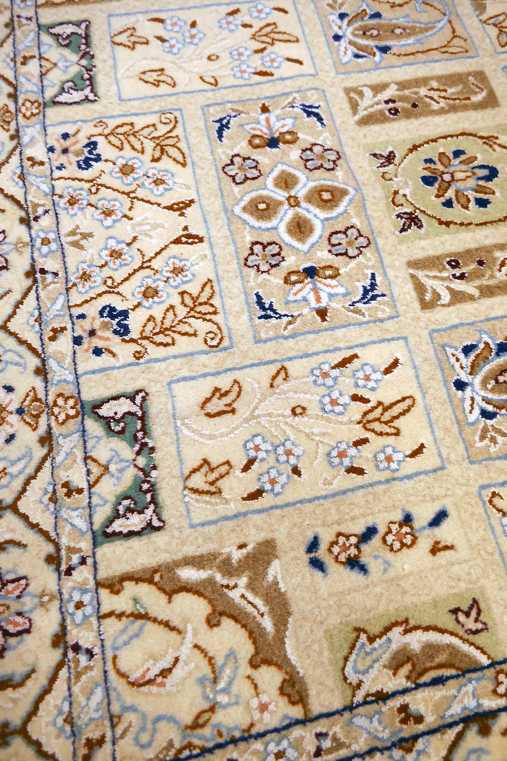 Dimensions : 210 x 130 cm -laine et soie- Pays Iran - Épaisseur : 9 mm - Densité de nouage : 360.000 Nœuds au m² - Surface : 2.73 m² - Poids : 6.83 Kgs - Age : contemporain - Confection : Noué main - Forme : Tapis de chambre - Type : Tapis persan