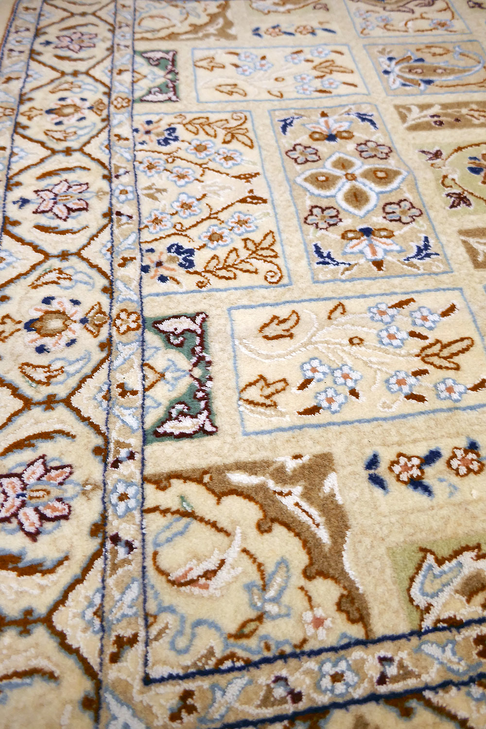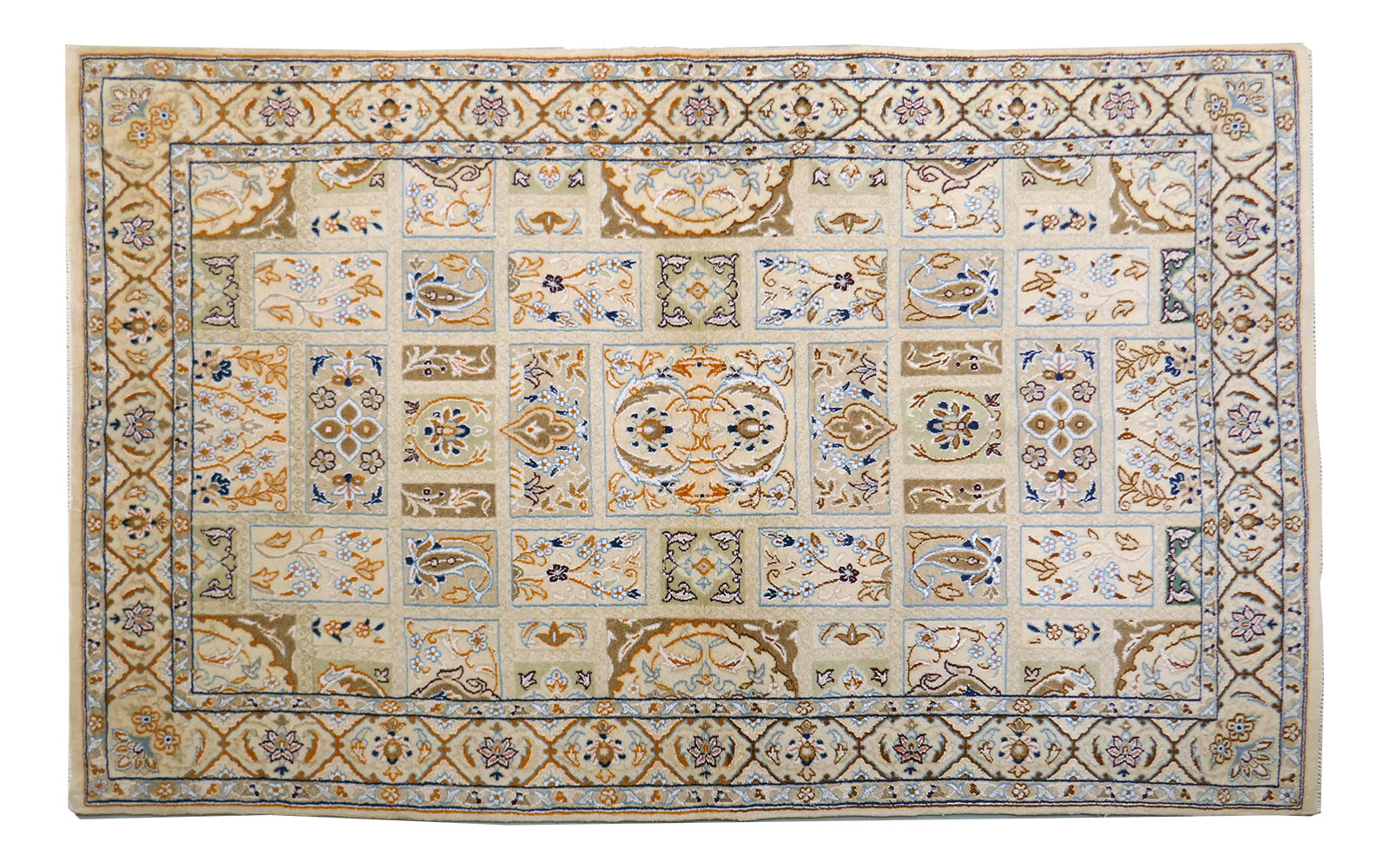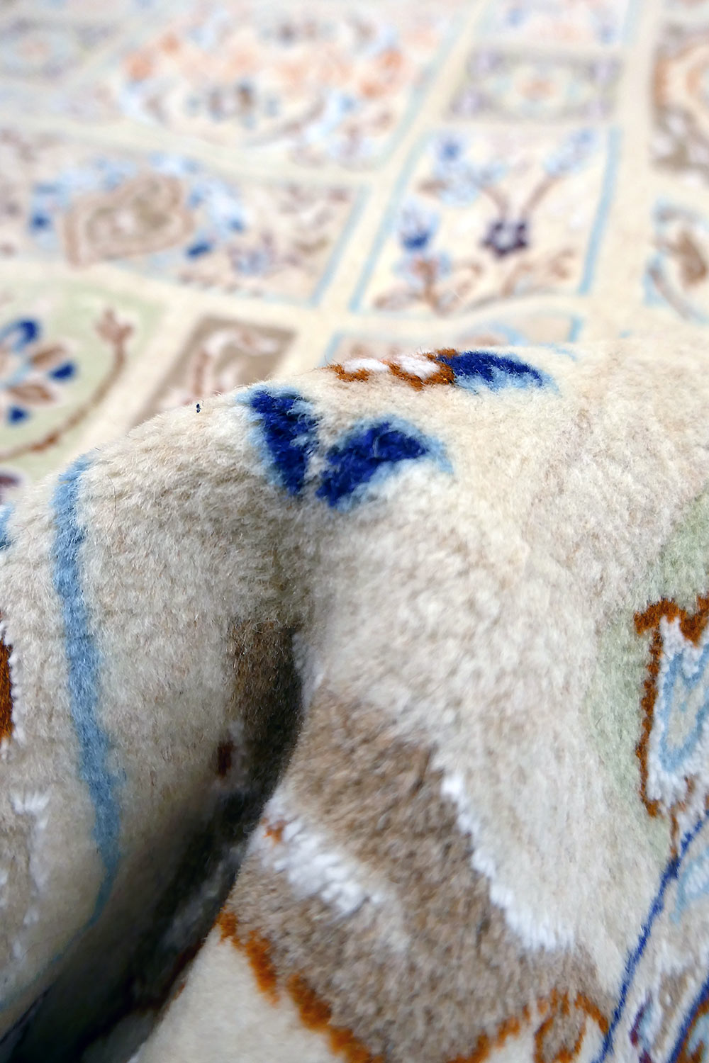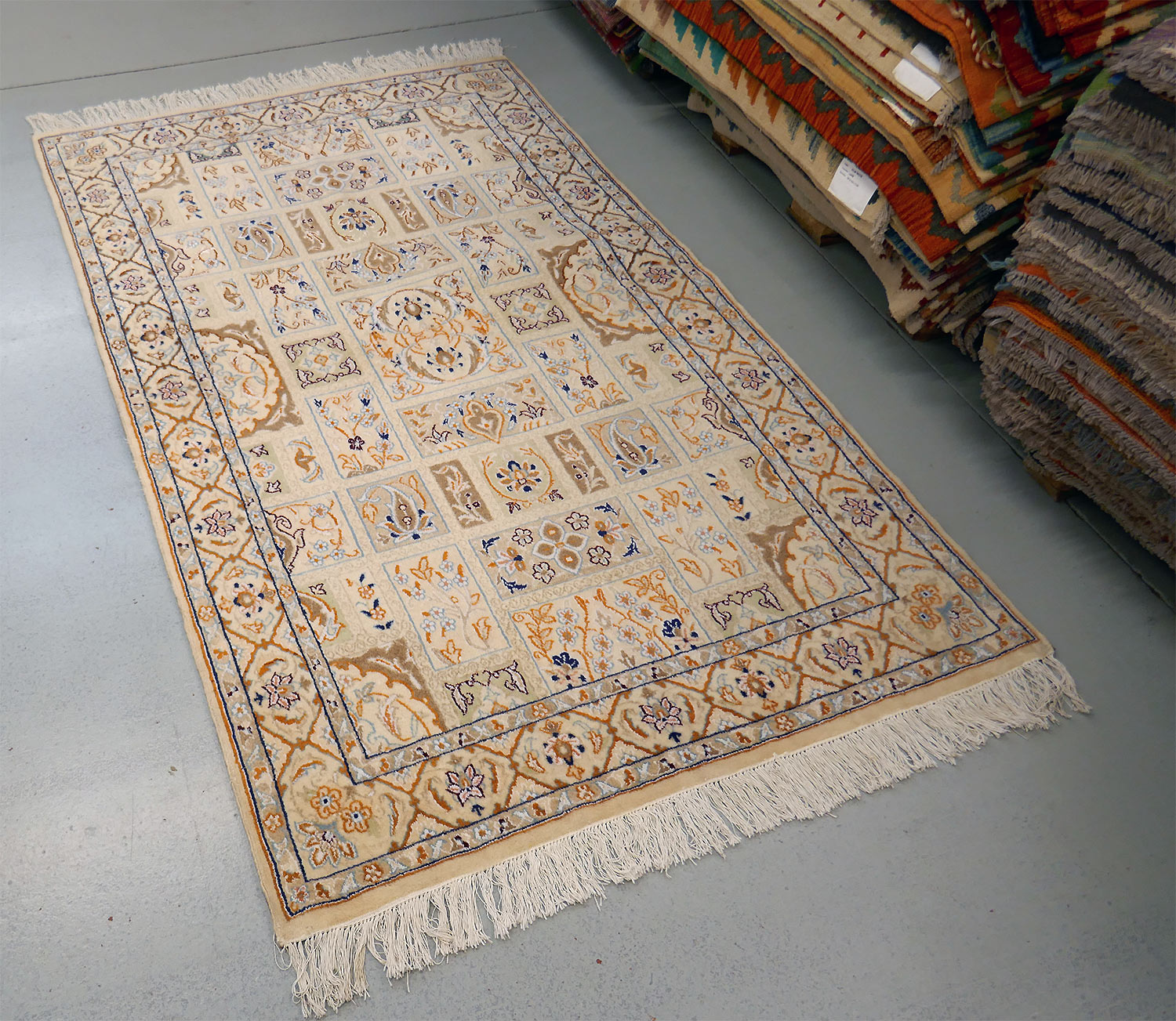 Dimensions : 210 x 130 cm -laine et soie- Pays Iran - Épaisseur : 9 mm - Densité de nouage : 360.000 Nœuds au m² - Surface : 2.73 m² - Poids : 6.83 Kgs - Age : contemporain - Confection : Noué main - Forme : Tapis de chambre - Type : Tapis persan