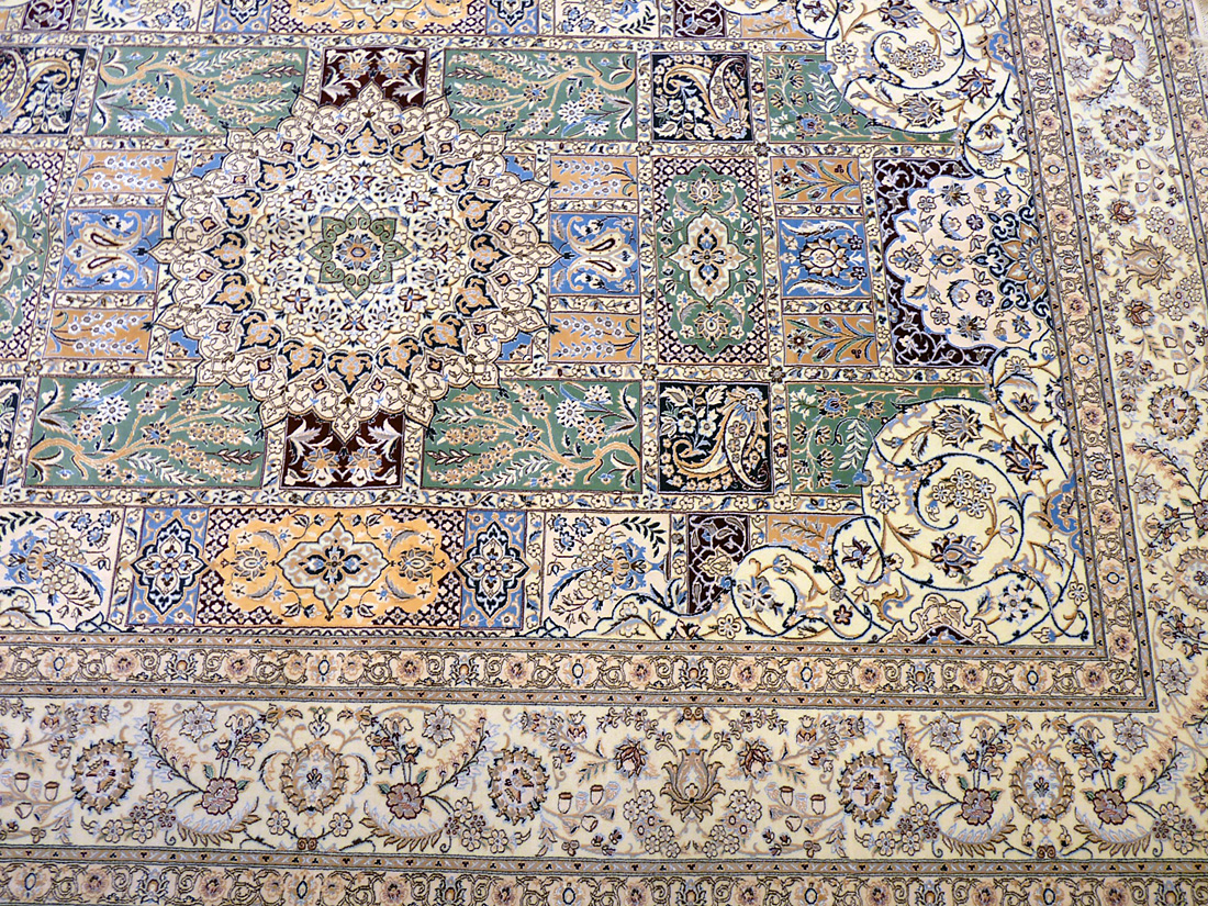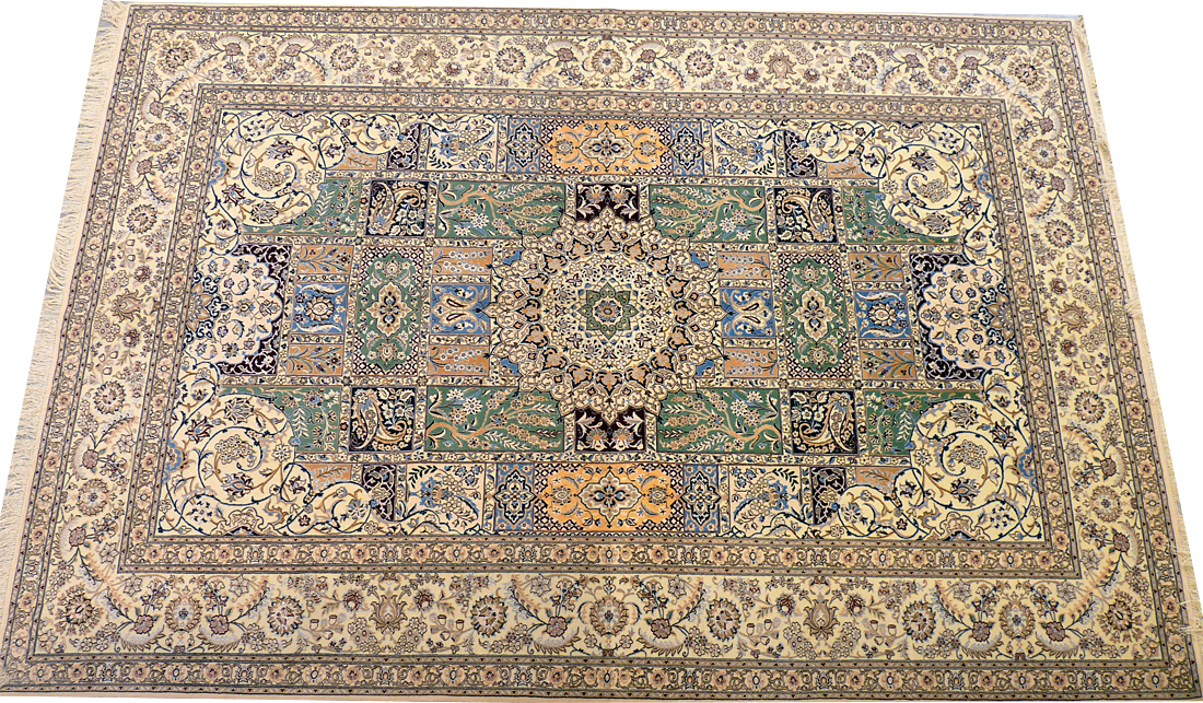 Dimensions : 298 x 207 cm -laine et soie- Pays Iran - Épaisseur : 8 mm - Densité de nouage : 800.000 Nœuds au m² - Surface : 6.17 m² - Poids : 15.42 Kgs - Age : contemporain - Confection : Noué main - Forme : Tapis de salon - Type : Tapis persan