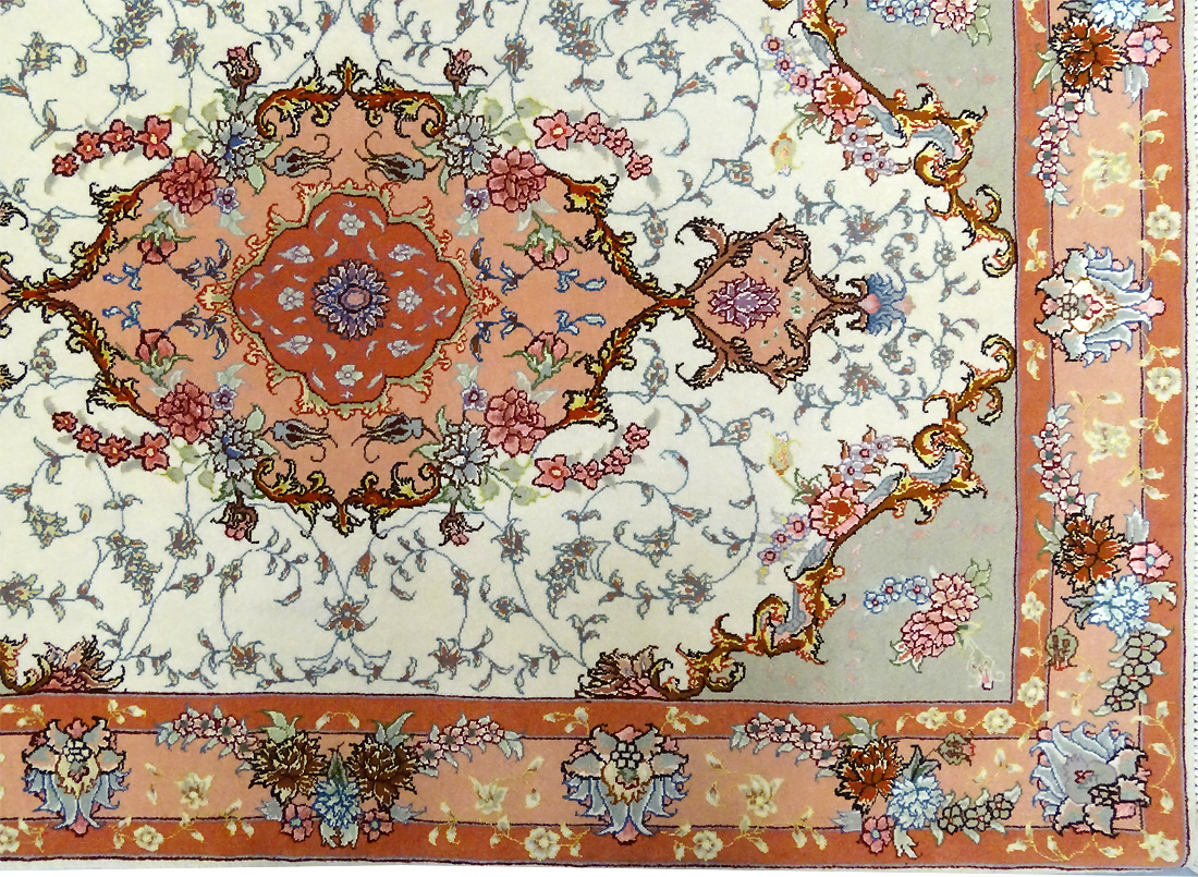 Dimensions : 155 x 100 cm -laine et soie- Pays Iran - Épaisseur : 8 mm - Densité de nouage : 800.000 Nœuds au m² - Surface : 1.55 m² - Poids : 3.88 Kgs - Age : contemporain - Confection : Noué main - Forme : Tapis de chambre - Type : Tapis persan